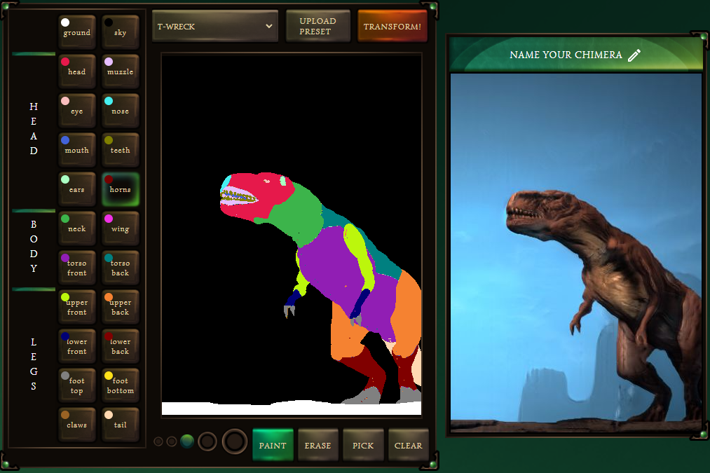 Nvidia Canvas는 풍경을 실사화하는 도구라면 Google의 Chimera Painter(키메라 페인터)는 이름처럼 괴물을 실사 이미지화하는 도구입니다. Chimera Painter는 상상하는 몬스터의 각 부위(머리, 눈, 코, 팔, 다리 등)에 해당되는 브러시로 그리기만 하면 현실감 있는 질감을 갖춘 몬스터 이미지를 생성해주는 툴입니다.