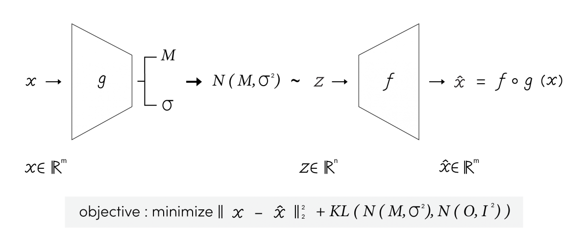 VAE의 인코더는 입력 데이터를 직접 잠재 공간으로 압축하지 않고, Reparameterization trick을 활용해 잠재 변수의 잠재 공간에서의 분포(latent distribution)를 나타내는 확률 분포함수의 파라미터를 생성합니다. 잠재 변수의 분포를 정규 분포로 가정하고, 입력값의 조건부 분포로 나타내는 경우, 아래와 같은 목적 함수를 최소화하면 학습이 진행됩니다.