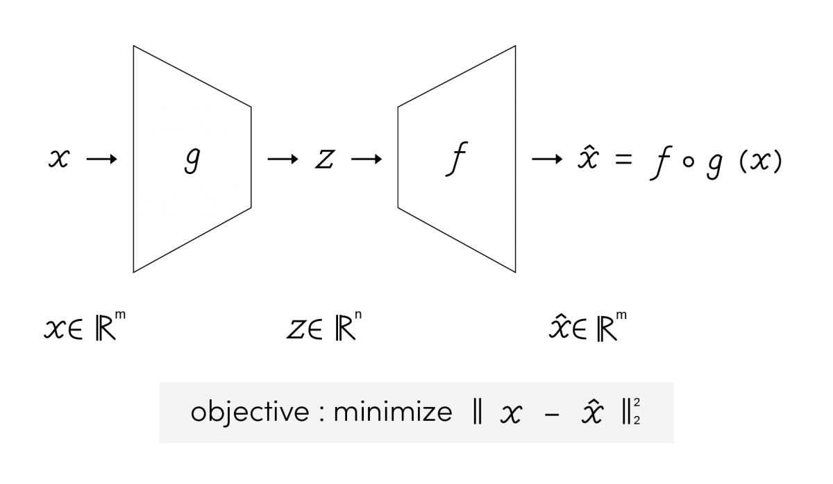 정상 데이터를 오토인코더를 통하여 원래의 데이터보다 작은 차원의 잠재 공간(latent space)로 압축 후에 다시 복원하고, 복원된 데이터와 원본 데이터의 차이를 비교함으로써 이상 탐지를 수행하는 방법입니다. 이때 정상 데이터를 저차원으로 압축(encoding)하는 부분을 인코더라고 하며, 압축된 샘플을 다시 원래의 차원으로 복원(decoding)하는 부분은 디코더라고 합니다. 그리고 인코더에 의해 데이터가 압축되어 나타나는 잠재 공간에서의 데이터의 표현형을 잠재 변수(latent variable)라고 합니다. 오토인코더는 원본 데이터와 복원된 데이터의 차이를 최소화하는 과정을 통해 학습하며, 그 과정에서 학습 데이터의 특징이 자연스럽게 추출되어 잠재 공간이 구성됩니다.