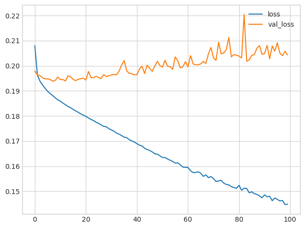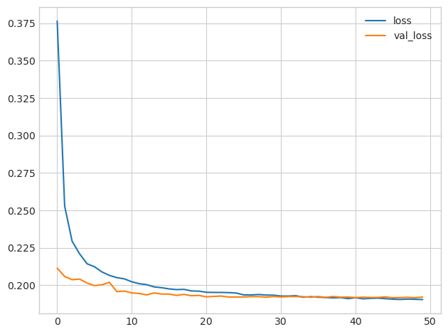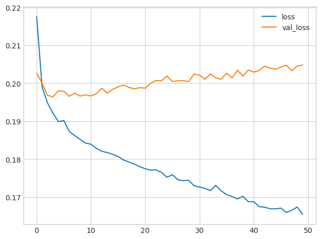 아래 dropout을 포함한 신경망의 학습 곡선을 보면 훈련 손실(loss)이 계속 감소하더라도 유효성 검사 손실(val_loss)이 일정한 최소값에 가깝게 유지됨을 알 수 있다. 이를 통해서 Dropout이 과적합을 방지하는 것을 확인할 수 있다.