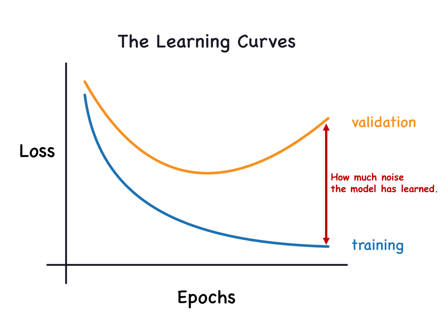 training loss와 validation loss 간격은 모델이 학습한 noise의 양을 의미한다.