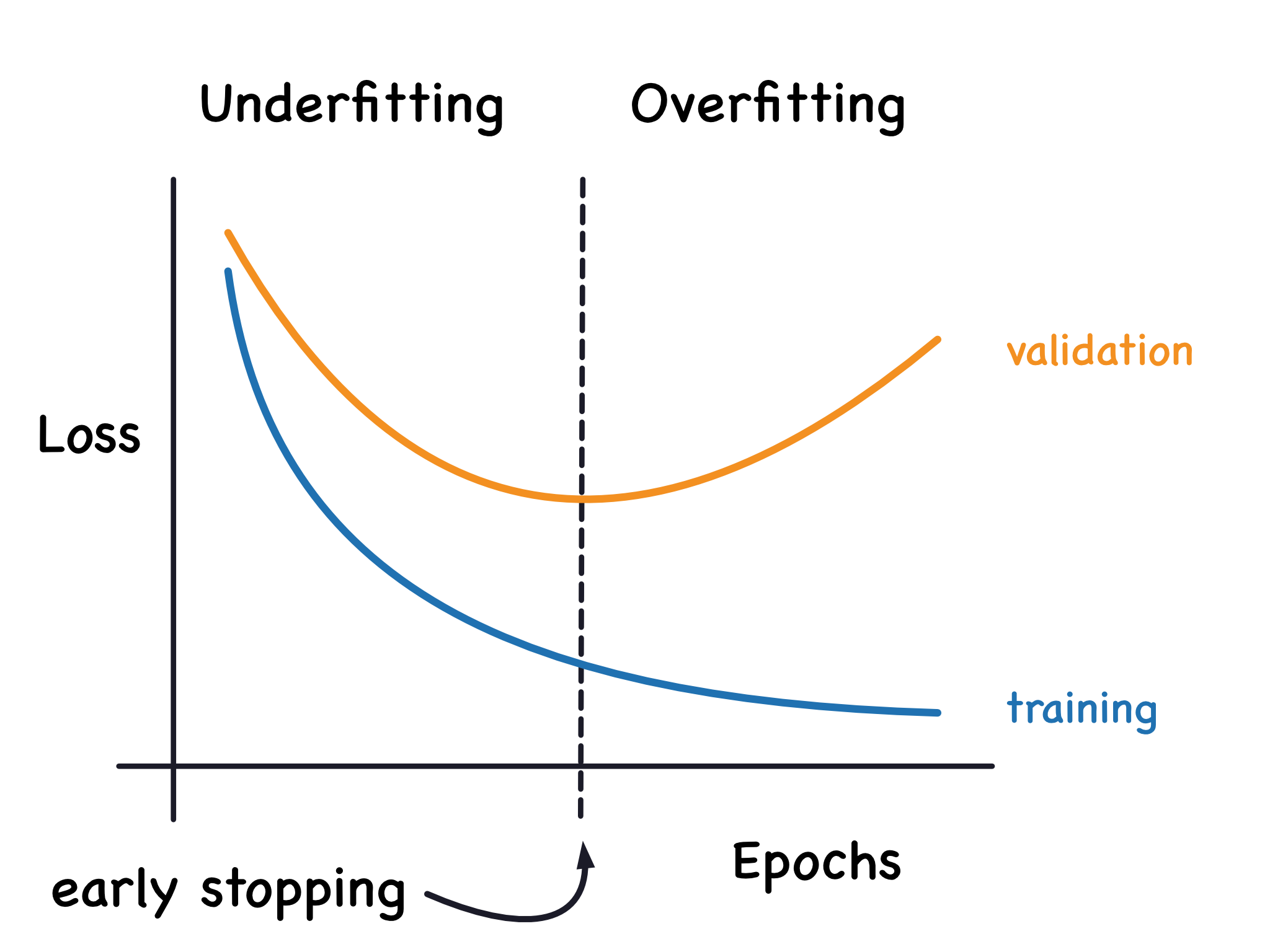 이를 방지하기 위해 validation loss가 더 이상 감소하지 않을 경우 학습을 중단할 수 있다.